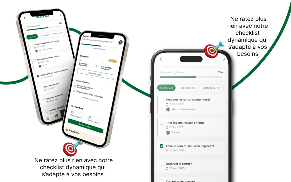 La plateforme centralise l’ensemble des actions liées au déménagement dans un espace unique, permettant à l’utilisateur de visualiser, organiser et prioriser chaque étape de son projet.